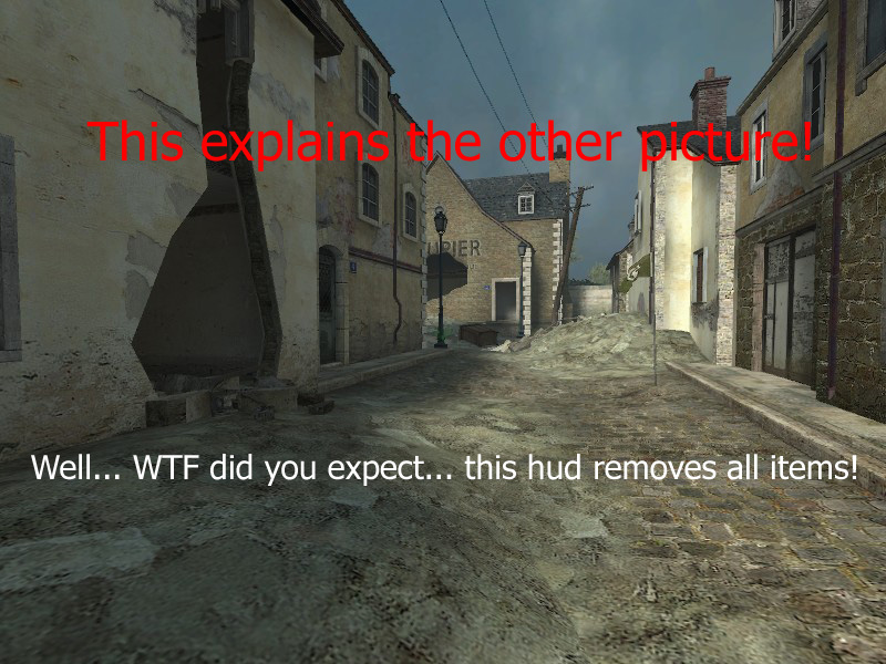 About the HUD... This HUD was made for people who use Fraps to record a game and want a "NO HUD" look. It is intended for off-line use ONLY! You can use this online ... BUT THINK FIRST!! Why? It removes objects like the Gun on first person view and all other HUD items. Now VAC may not ban you but it could or a plug-in might in the near future... you have been warned.