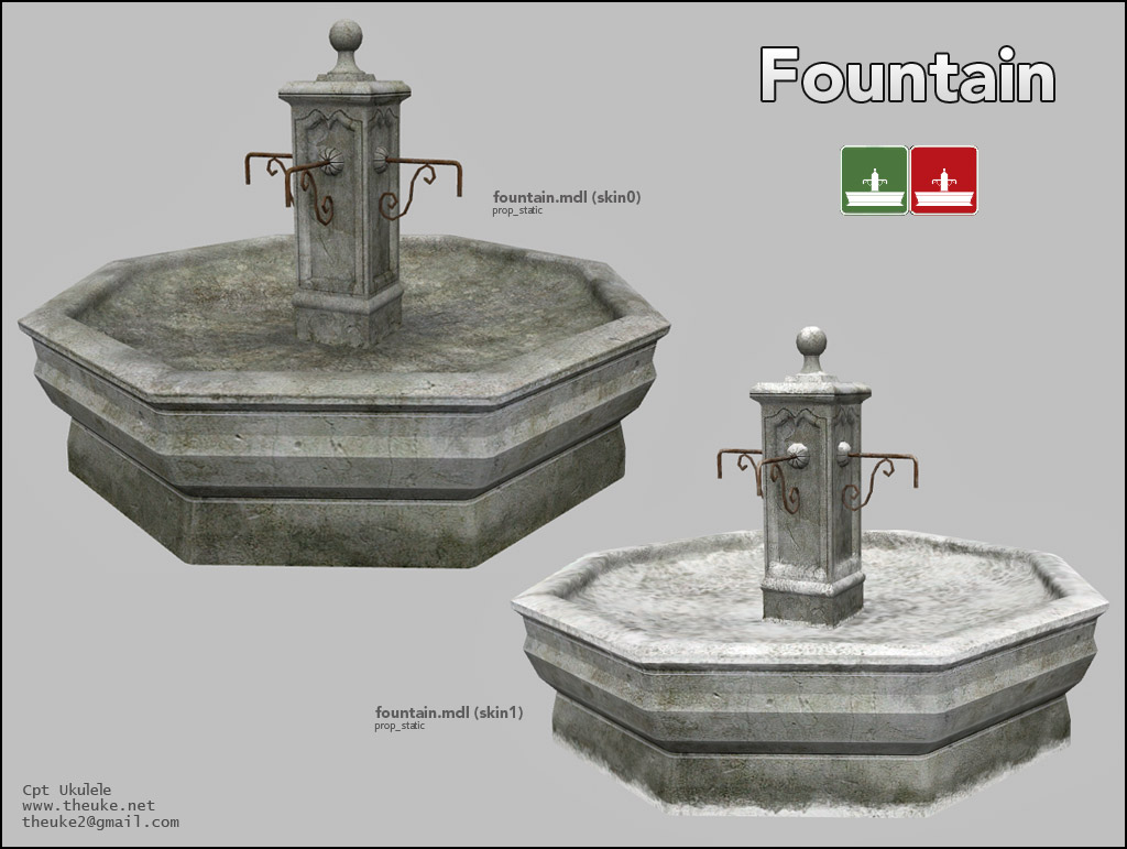 Model of a fountain: 2330 tris at LOD0, down to 430 tris at LOD2; 2 skins (diffuse 1024^2). Objective icons included.