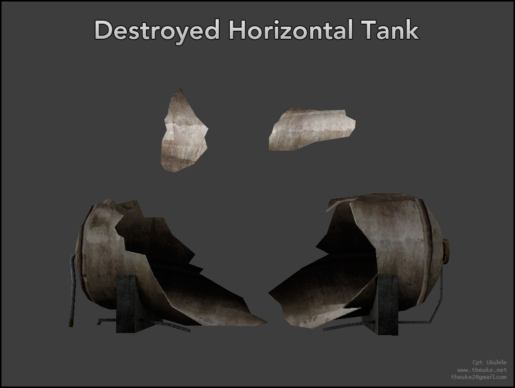 Destroyed version, with 2 gibs, of Valve's horizontal cooling tank. Uses Valve's texture and base mesh; can only be used in DoD:S.