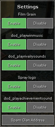 What are default settings? When using the menu you will notice a lot of green buttons, these are colored green because they are the default setting, if you can't remember what it was always click the green one! Some sections like the netcode section have more than one green button, that's because there is no true default for netcode, it depends on a user's ISP connection, however if you pressed other netcode options the three buttons take you back to what VALVe will set for the basic command set for your speed.