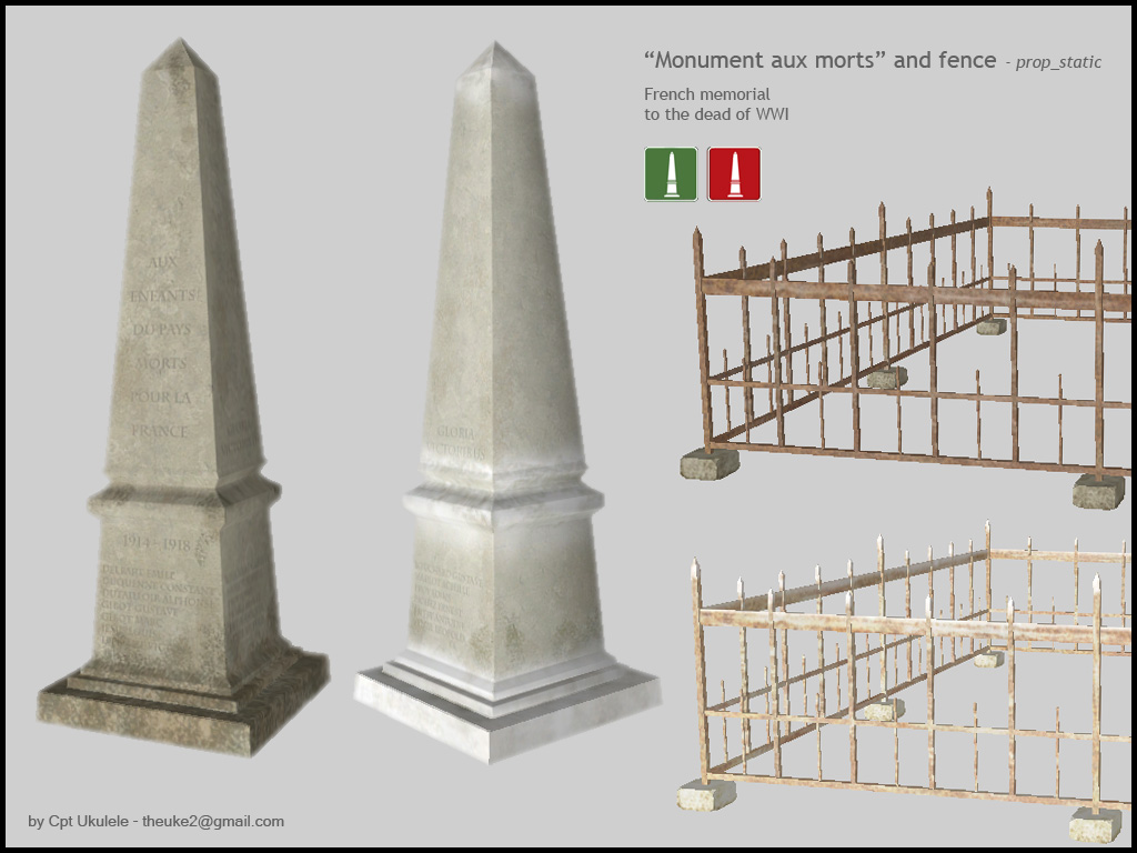 Model of a fountain: By Cpt Ukulele 2330 tris at LOD0, down to 430 tris at LOD2; 2 skins (diffuse 1024^2). Objective icons included