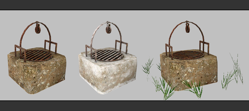 Texture 1024x512 (256^2 for the grass). 940 tris (630 at LOD1).