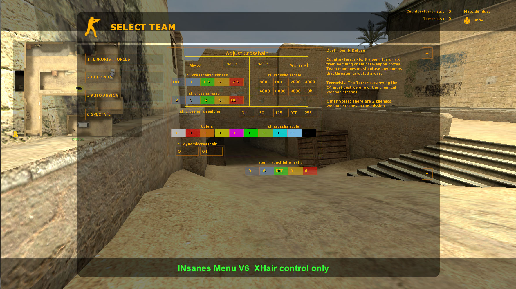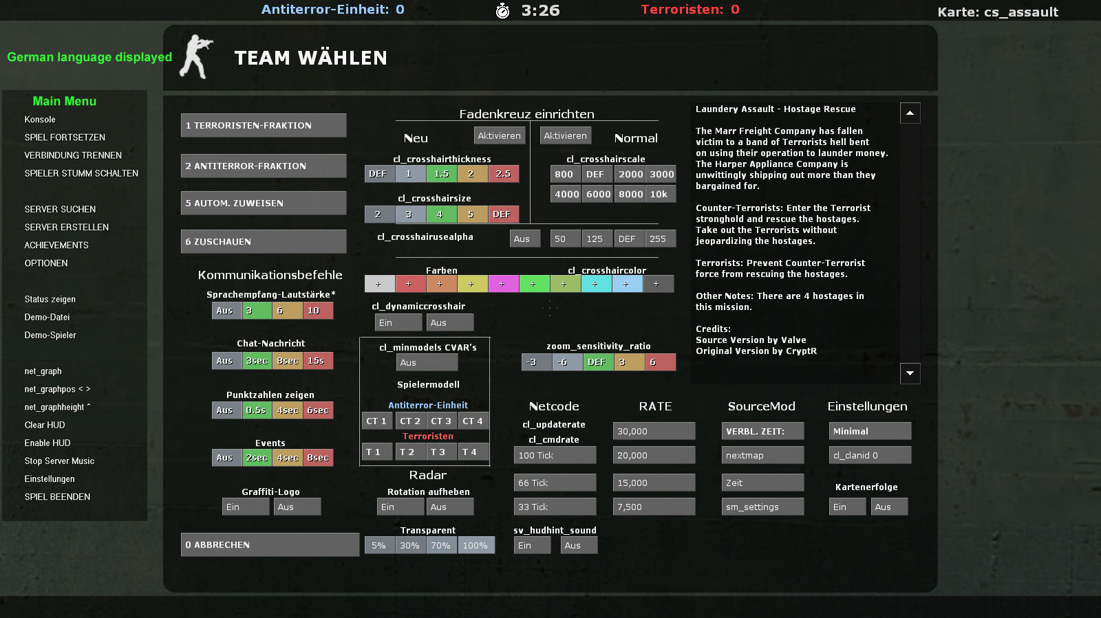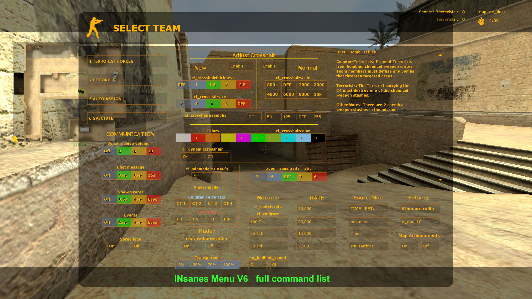 2 x Team Menus, one full of commands, one dedicated for XHairs only and zoom. These Menus have labels that are the command or they are labeled using VALVe's own language files. The effect this has is the files follow the users language...we do not all speak English you know!