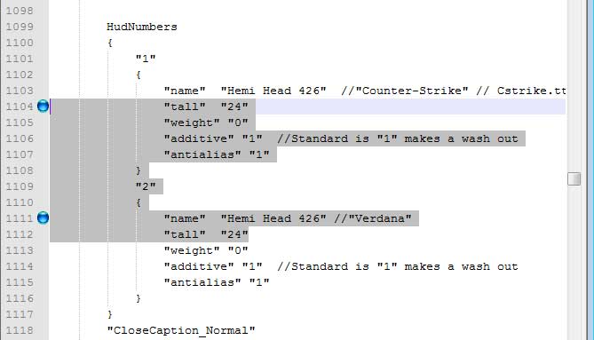 You now need to adjust the clientscheme.res in a couple of places at least. Go to the bottom of the file, you can see the standard ones in there named as , follow the naming format, in this section that is the file names of the font ...