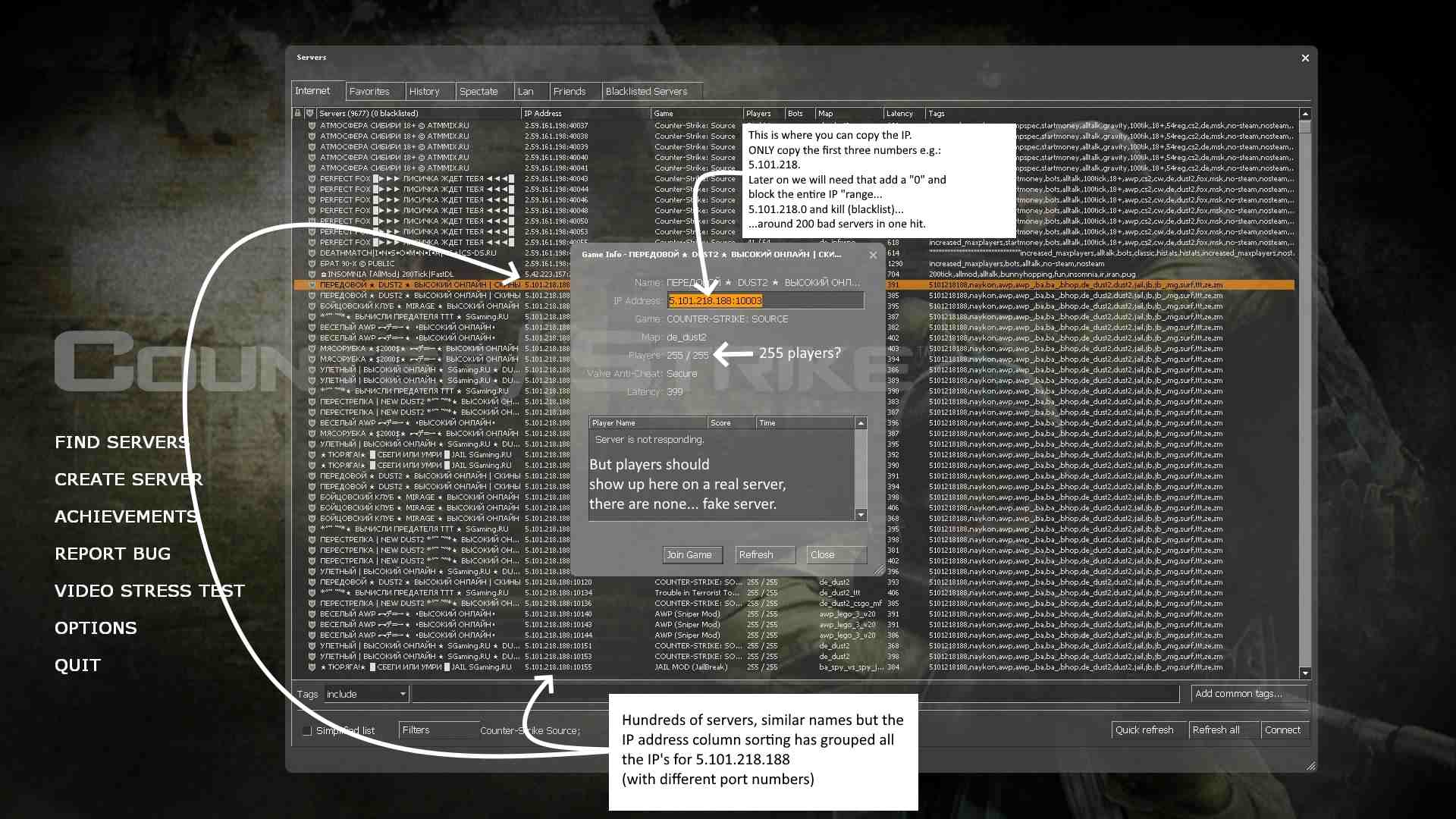 That alone should tell you that the entire 200 or so servers listed on that base IP of "5.101.218.188" are all...fake servers.