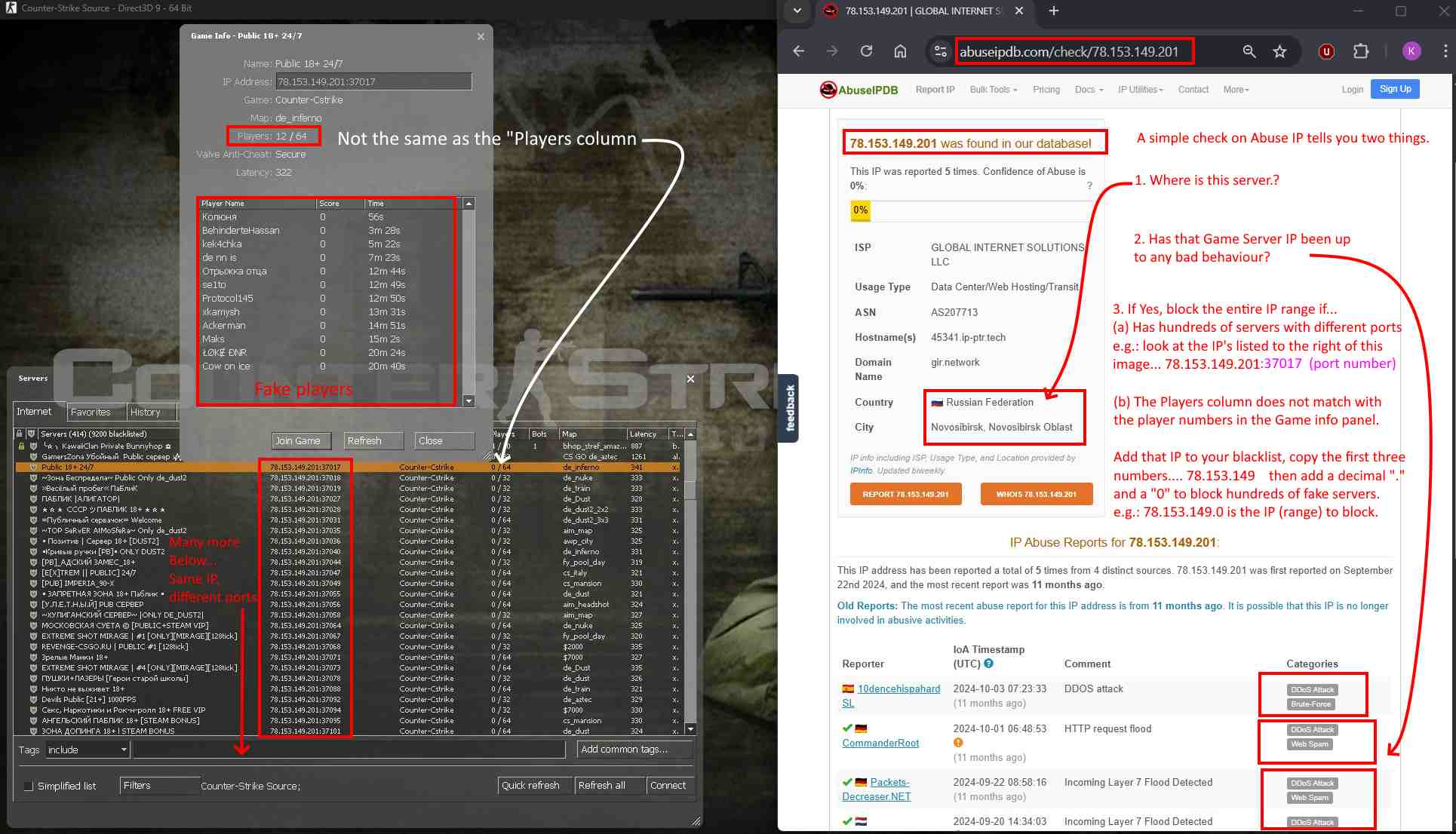 In CS:S IP's using AbuseIP you will also note the same, and also look for the reports below... hacking, port scanning... then... use the X.X.0.0/16 type and the ISP ./ provider is rotten to the core... block any others as you may never play on a Russian server anyway.