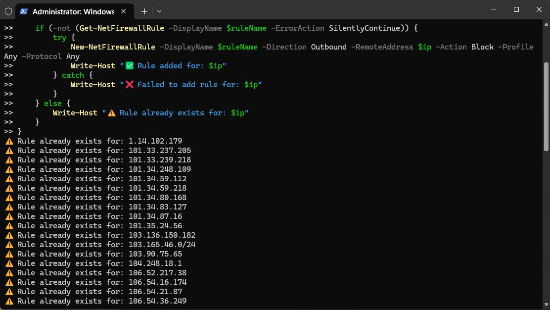 If the format of the file powershell is reading gets messed up you may see a red flash as it’s compiling the list into a rule.