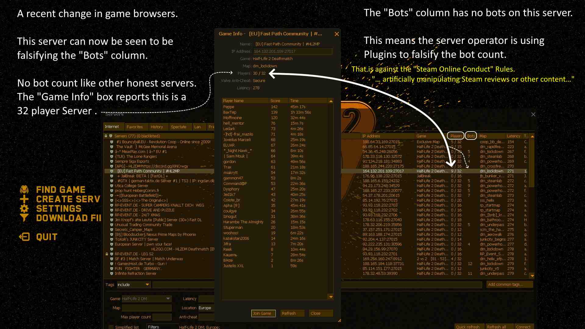 But when you see a server in the Steam game server browser having no bots and in these lists they do... then the server operator may be up to more than just telling a small lie and bending a few Steam code of conduct rules about bot amounts, they are likely... a scamming scumbag outfit you may want to avoid.